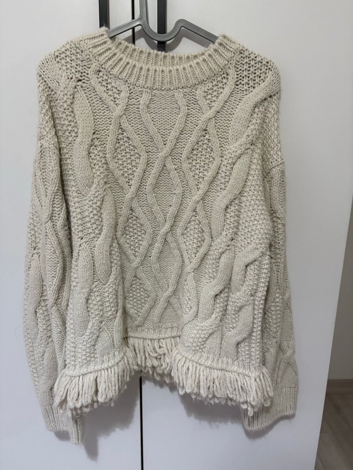 S M beden uyumlu. Bej renkli, örgü dokulu, bohem tarzda, yuvarlak yaka ve uzun kollu, salaş kesim kadın kazak. Alt kısmında püskül detayları bulunur. Günlük kullanıma uygundur.