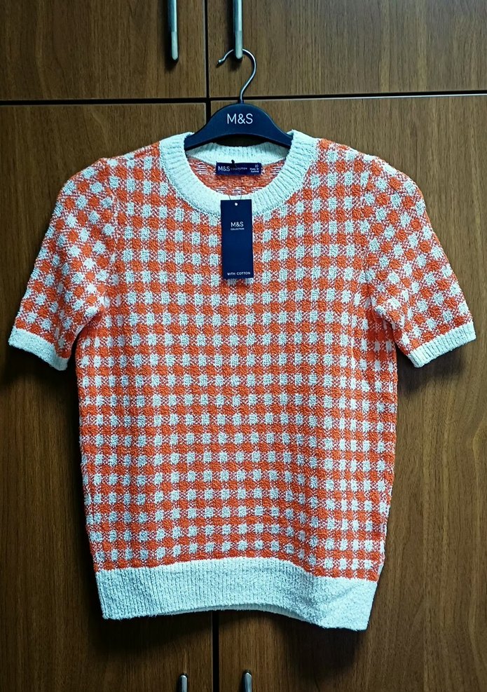 M&S marka, kısa kollu, çok renkli örgü kadın kazak. Salaş ve kısa kesim, rahat ve günlük kullanım için uygun.