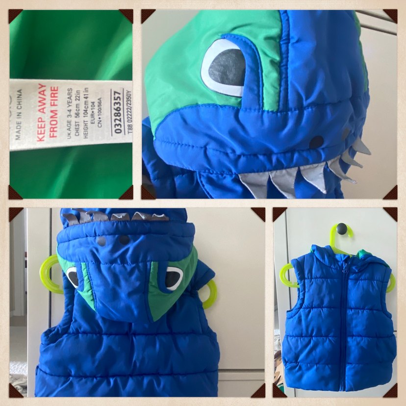 Marks and Spencer pofuduk çocuk yelek. Başlığındaki dinazor tasarımı çok tatlı duruyor ve çocuklar severek giyiyor. Yanlarda minik cepleri var fermuar sorunsuz renklerinde solma vs yok Ölçüleri etikette bulabilirsiniz. 3-4 yaş uygun