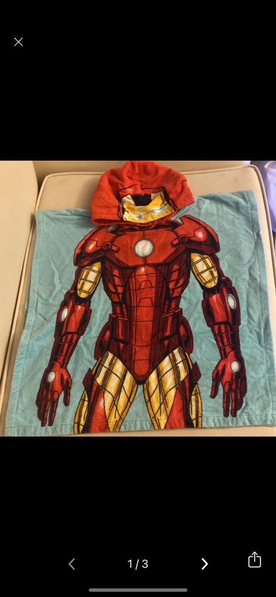 Kaptan Demir Adam baskılı, koyu kırmızı renkli, kapüşonlu yumuşak ve emici erkek çocuk bornozu. 4-5 yasa uygun. Pamukludur. Etiketsizdir.