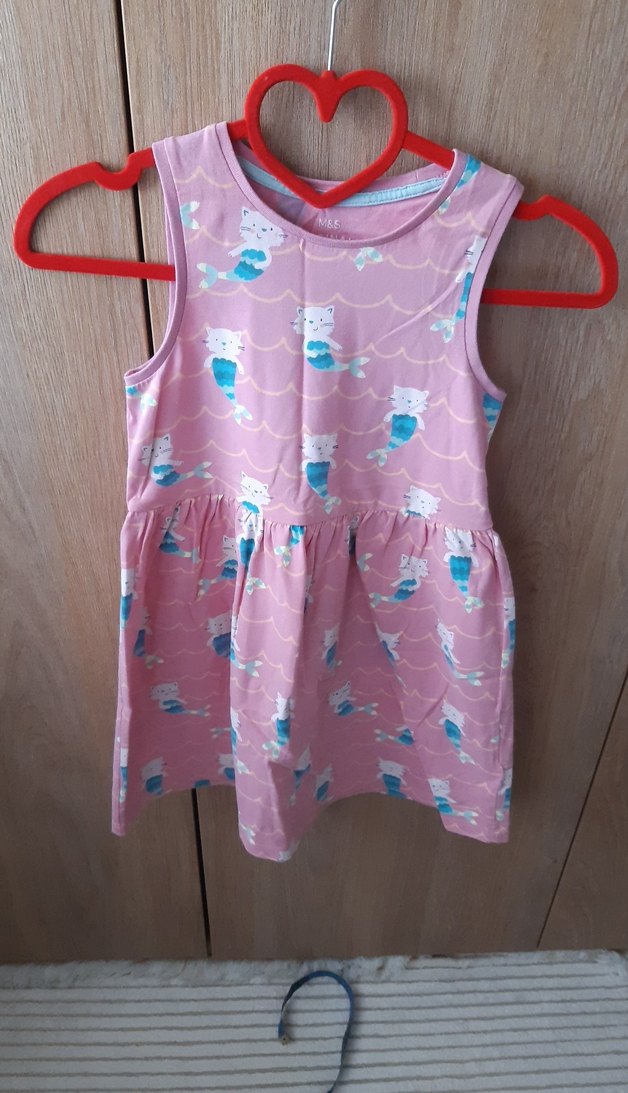 Kolsuz, baskılı kedi desenli pembe elbise. Kalin penye kumas, 6-7 yaş, buyuk kalip. boyu 64 cm ve eni 31 cm. marks&spencer kalitesi