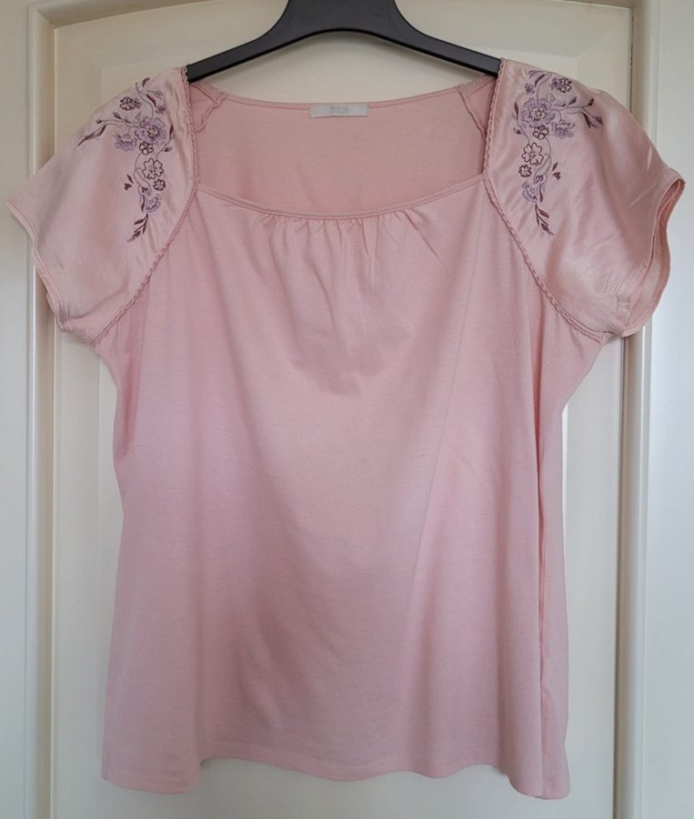 Marks &Spencer pembe pastel renkte, kısa kollu ve kayık yaka %100 cotton t-shirt. Kollarinda ipek üstü çiçek nakışlı detaylı ve dökümlü. iki koltukaltı arası 56cm, boyu 60cm #Marks&Spencer #M&S #tshirt #bluz #nakış #koton #ipek