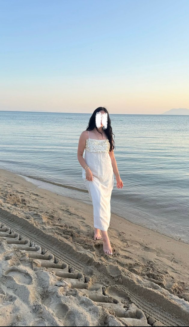 Beyaz keten kumaştan, askılı ve drapeli detaylara sahip, bol kesim uzun elbise, büyük beden olarak alındı 36 beden olark ayarlatldı terzide bir kez giyildi
