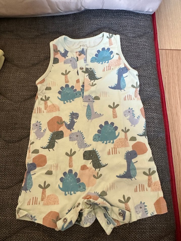 Kolsuz, pastel renkli çoklu dinozor desenli erkek bebek tulumu. Yumuşak örme kumaştan, askısız yaka ve alt kısmında kolay bez değiştirme için çıtçıtlıdır. 6-9 ay için uygun leke yırtık yok çok az giyildi