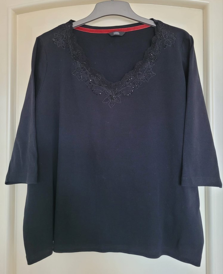 Marks&Spencer siyah renkli, V yaka ve uzun kollu bluz, bol kesime sahiptir. Yakası dantel ve parlak işlemeli boncuk ile süslenmiştir, kolu 3/4 koludur, iki koltukaltı arası 58cm, boyu 60cm, %100pamuk #M&S #Marks&Spencer #Bluz #Dantel #Vyaka #3/4kol