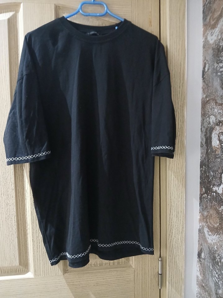 M ve L bedene uyumlu çok şık tişort. Siyah renkli, kısa kollu ve yuvarlak yakalı erkek tişörtü, bol kesim ve normal boy uzunluğundadır. Kollar ve etek kısmında beyaz dikiş detayları bulunur.2kez giyildi sıfır ayarındadır