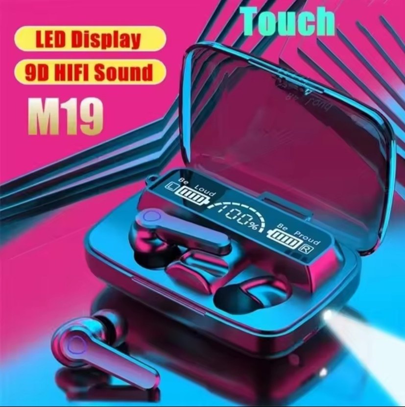 M19 Bluetooth kulaklıklar, dokunmatik kontrol ve pil durumu gösteren LED ekran içerir. Net ses kalitesi sunar. Aynı zamanda led ışık içerir.