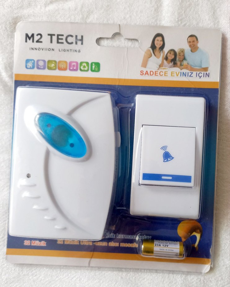 M2 Tech kablosuz kapı zili seti, beyaz alıcı ve mavi zil simgeli beyaz düğme içerir. 12V 23A pil ile çalışır, sadece ev kullanımı için uygundur.