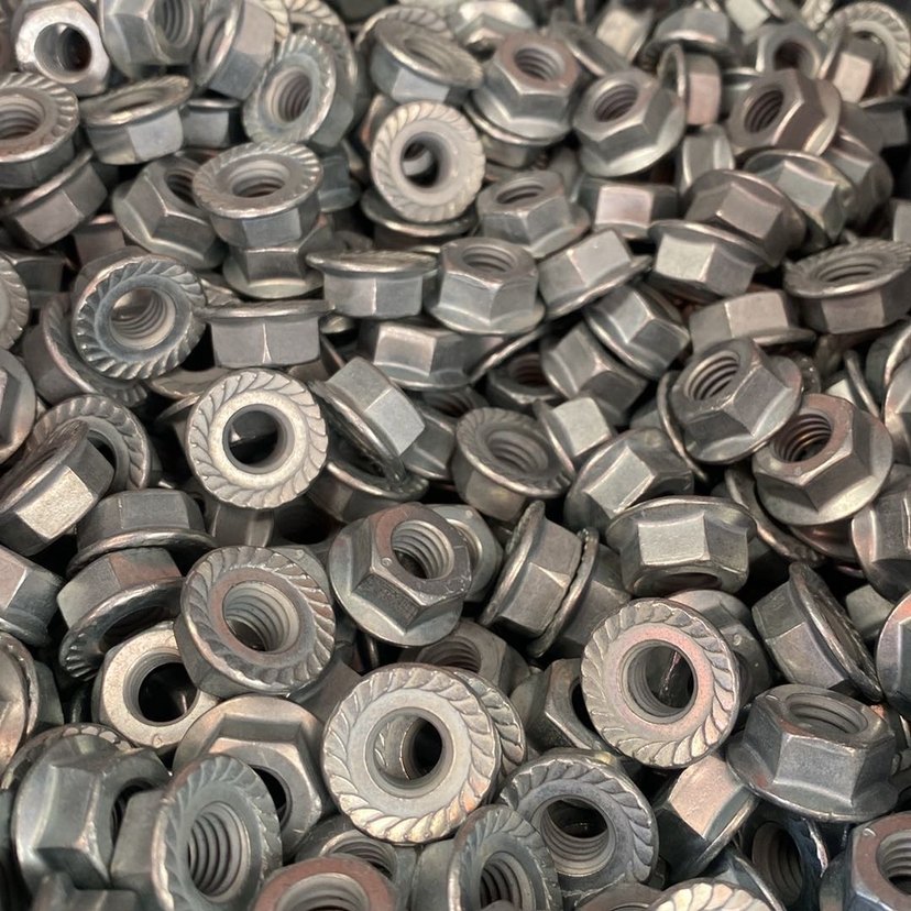 M8 flanslı somun 100 Adet Gri renkte, kenarları desenli metal somunlar, farklı montaj ihtiyaçları için uygundur.