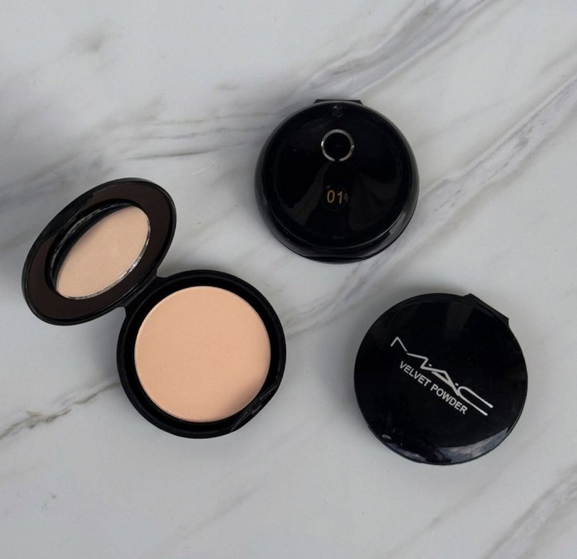 MAC Velvet Powder açık bej tonunda, cilde pürüzsüz ve mat bir görünüm sağlar. Kompakt kutusu kolay taşınır ve kullanılır.