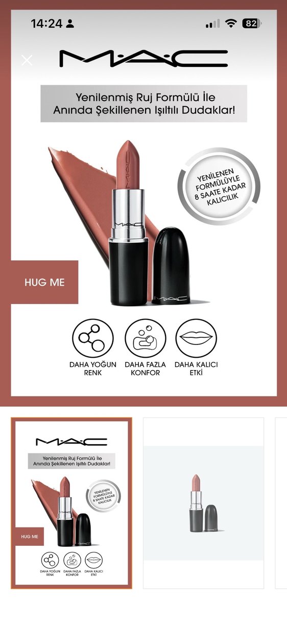 MAC Hug Me ruj, yenilenen formülüyle 8 saate kadar kalıcılık, daha yoğun renk ve yüksek konfor sağlar. Bej tonlarda.