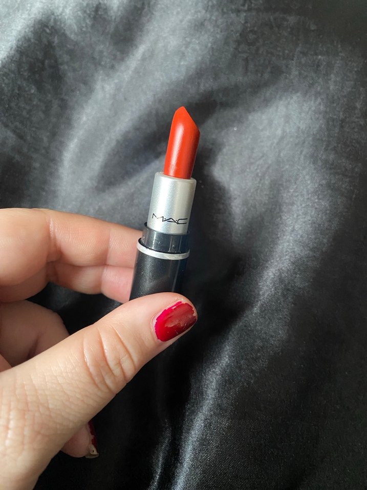 MAC kırmızı ruj, canlı renkte ve şık siyah-gümüş ambalajda. Cesur dudaklar için ideal.