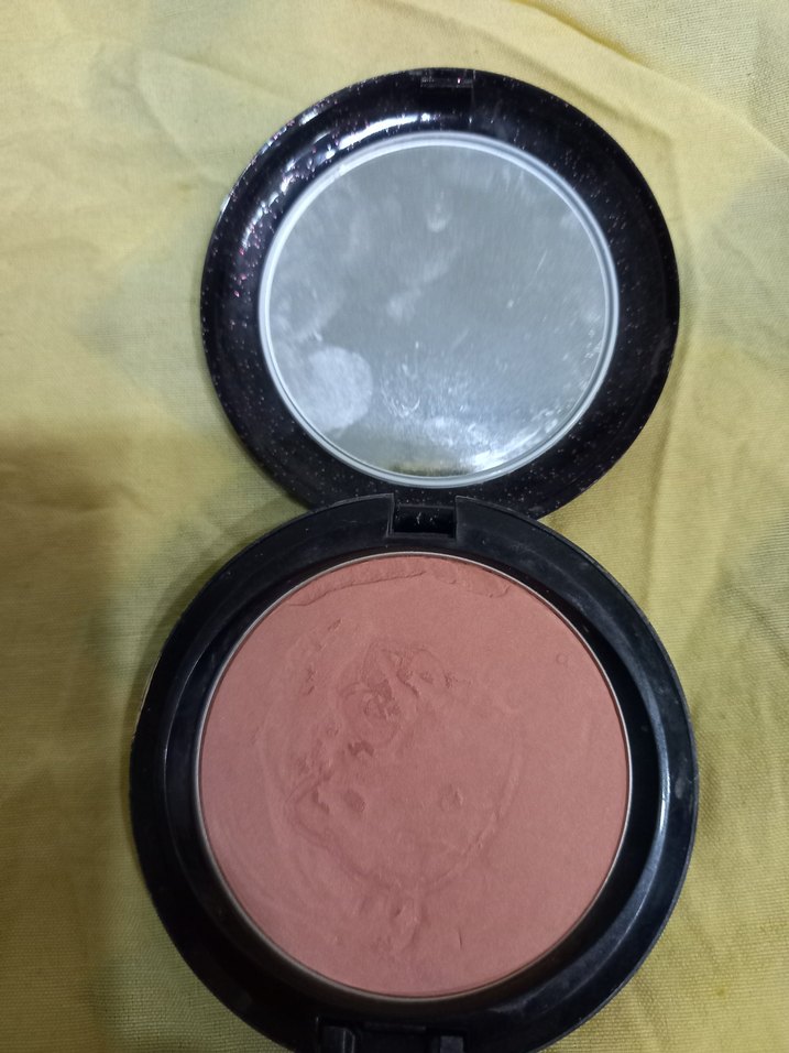 Koyu bej renkte, kompakt kutuda ayna içeren yumuşak dokulu allık.