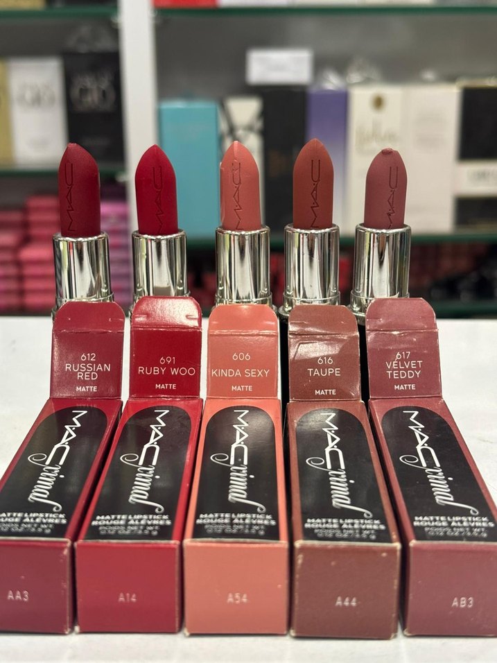 MAC mat ruj seti, Rus Kırmızısı, Ruby Woo, Kinda Sexy, Taupe ve Velvet Teddy canlı kırmızı tonlarıyla zengin renk sunar.