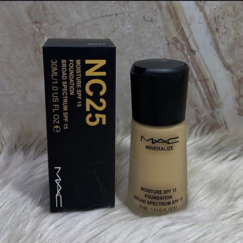 MAC Mineralize NC25 fondöten, nemlendirici ve geniş spektrumlu SPF 15 koruması sunar. 30 ml şişede parlak bej renktedir.