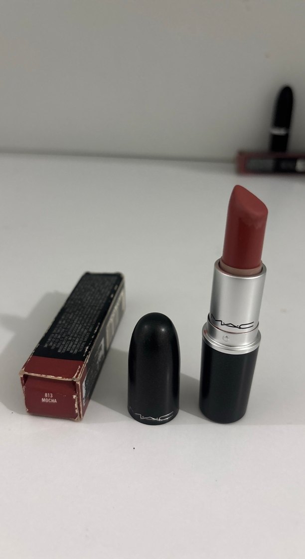 MAC mat ruj, koyu bej tonunda, zengin renk ve pürüzsüz bitiş sunar. Siyah kutu ve gümüş detaylı klasik ambalajıyla. Ten rengime uyumlu olmadığından satışta tamamı duuruyor fotoda görünüyor