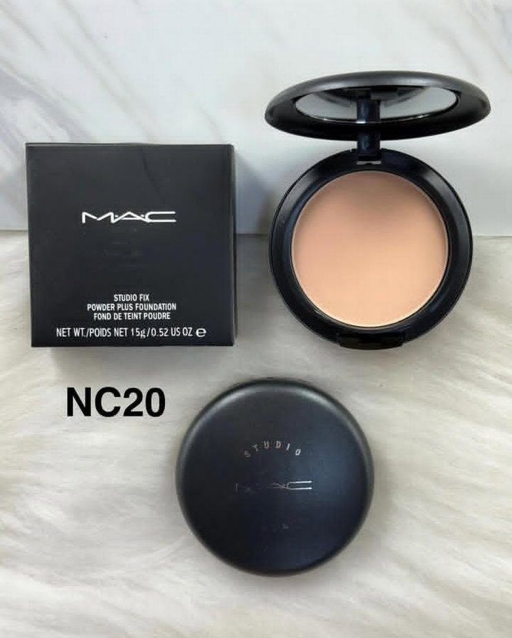 MAC Studio Fix fondöten, NC20 bej tonunda, doğal bir görünüm için pürüzsüz bir kapatıcılık sağlar. Kompakt tasarım ve ayna içerir.