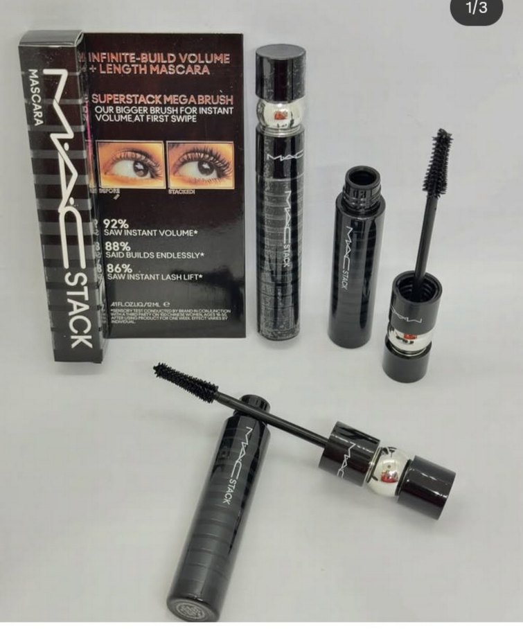 MAC Stack siyah maskara, sonsuz hacim ve uzunluk için özel fırçaya sahiptir. Optical metin: STACK, 88%, 86, ILDSENDLESSLY.
