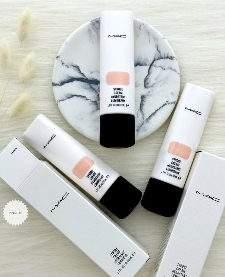 MAC Strobe Cream, cildi nemlendirir ve parlaklık kazandırır. Beyaz tüp ve siyah kapaklı ambalajda sunulur.