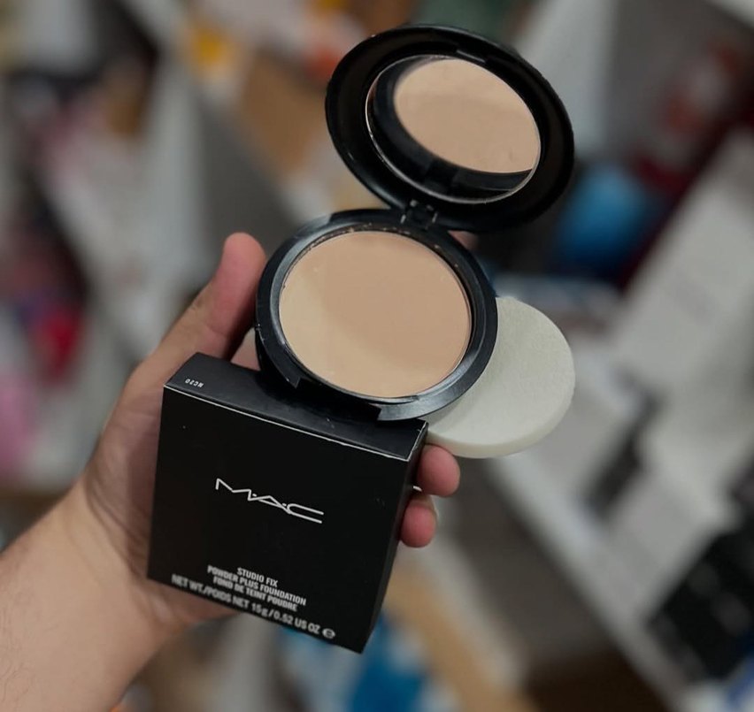 MAC Studio Fix açık bej renkli pudra fondöten, kompakt kutu ve sünger aplikatör ile birlikte. Pürüzsüz kapatıcılık sağlar.