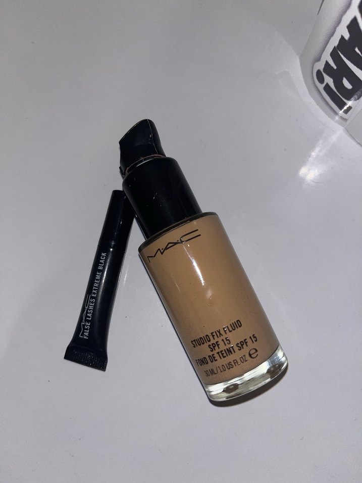 MAC Studio Fix sıvı fondöten koyu bej tonunda, SPF 15 içerir. Yanında küçük siyah yüz sabitleyici tüp bulunur.