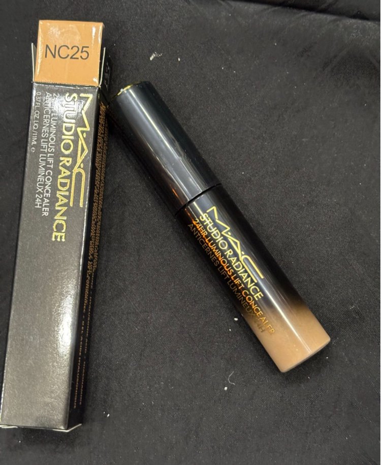 MAC Studio Radiance kapatıcı, NC25 tonunda koyu tenler için uygun bej renkte, orta ila tam kapatıcılık sağlar. Siyah-bej degrade tasarımlı şık tüpte sunulur. ✨