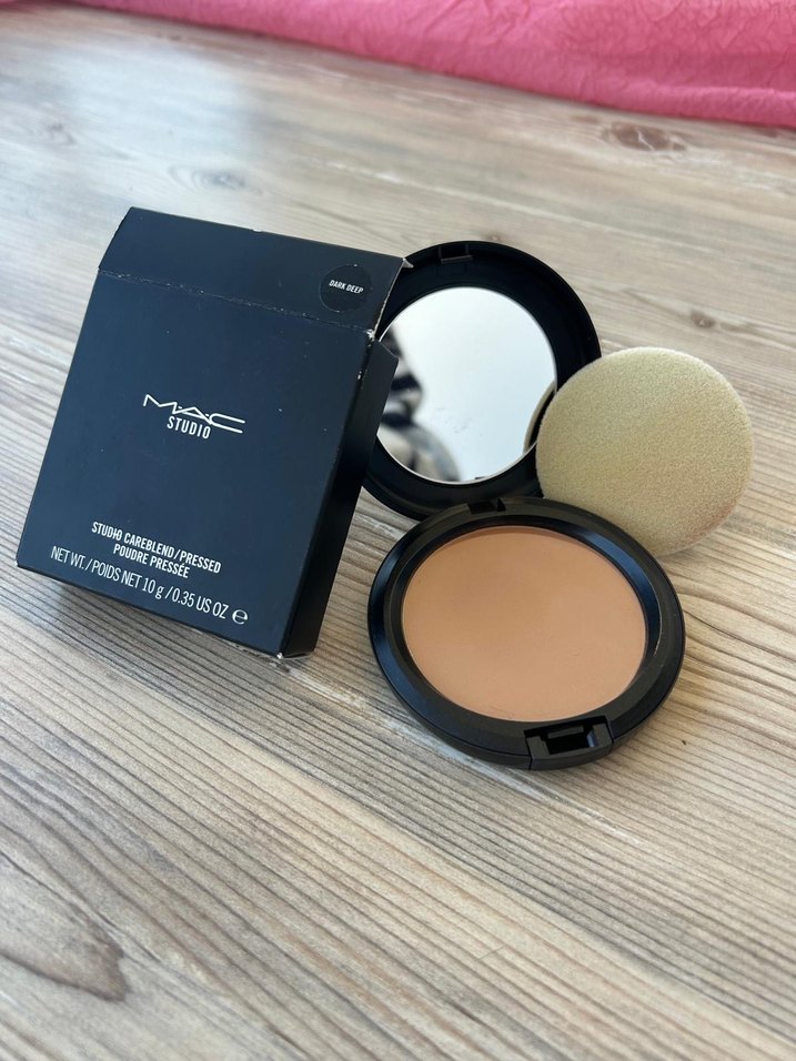 MAC Studio sıkıştırılmış bej pudra, içindeki ayna ve sünger aplikatör ile birlikte. Parlak bej tonunda. ✨