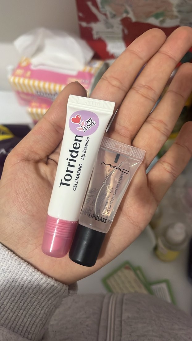 Torriden ve MAC markalarına ait, pastel pembe tonlarında iki dudak parlatıcısı, parlak bir görünüm sağlar.