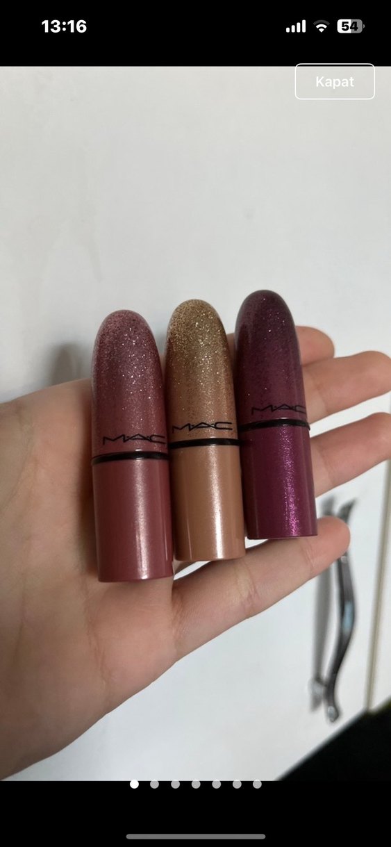 Mat ve ışıltılı bitişli, koyu bej ve canlı tonlarda üçlü MAC ruj seti. yılbaşı setinden