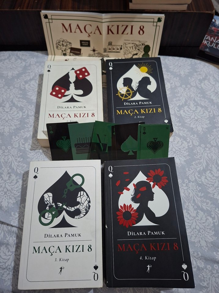 Dilara Pamuk'un 'Maça Kızı 8' adlı dört kitaplık serisi, her biri sembolik kapak tasarımlarına sahip. 1'den 4. kitaba kadar kutulu set halinde sunulmuştur.