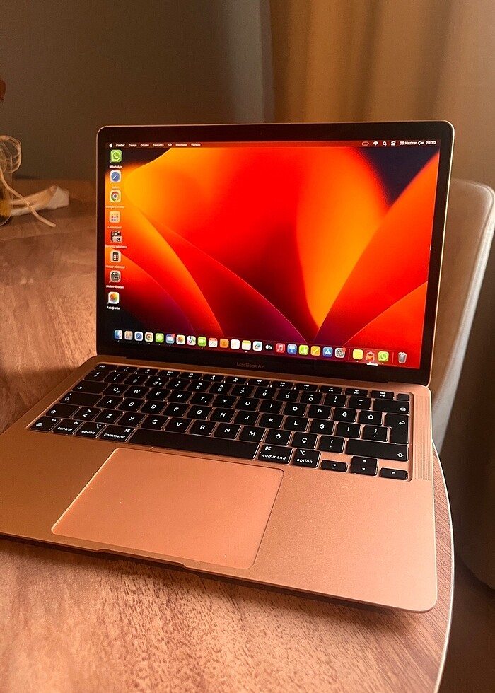 Çiziksiz, darbesiz, çok temiz kullanıldı. Hiçbir teknik sorunu yok, tüm fonksiyonları sorunsuz çalışıyor. *Apple garantisi 13 Şubat 2026’ya kadar devam ediyor.* Orijinal şarj aleti ve kutusu ile birlikte verilecektir. Günlük kullanım, okul, ofis işleri ve içerik tüketimi için ideal. Ciddi alıcılar yazabilir. Özellikleri: - *Model:* MacBook Air - *Model Yılı:* 2020 - *İşlemci:* Apple M1 çip, yüksek performans ve enerji verimliliği - *RAM:* 8 GB (veya 16 GB, hangisi ise) hızlı ve sorunsuz çoklu görev desteği - *Depolama:* 256 GB SSD (veya başka kapasite) ile hızlı veri erişimi ve geniş depolama alanı - *Ekran Kartı:* Paylaşımlı (Apple entegre grafik birimi), kaliteli grafik performansı - *Ekran Boyutu:* 13 inç Retina ekran, 2560 x 1600 çözünürlük ile canlı ve net görüntü - *Pil:* Uzun pil ömrü ile gün boyu kesintisiz kullanım - *Durumu:* Çok iyi, çiziksiz ve temiz kullanım - *Garanti:* Var.