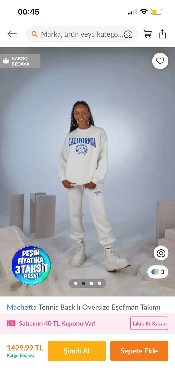 Beyaz renkli, oversize kesim ve bisiklet yaka olan eşofman takımı, "California" baskılıdır. Yumuşak ve rahat kumaştan, midi boy ve bol kesimdir. Spor ve sokak stili için uygundur.
