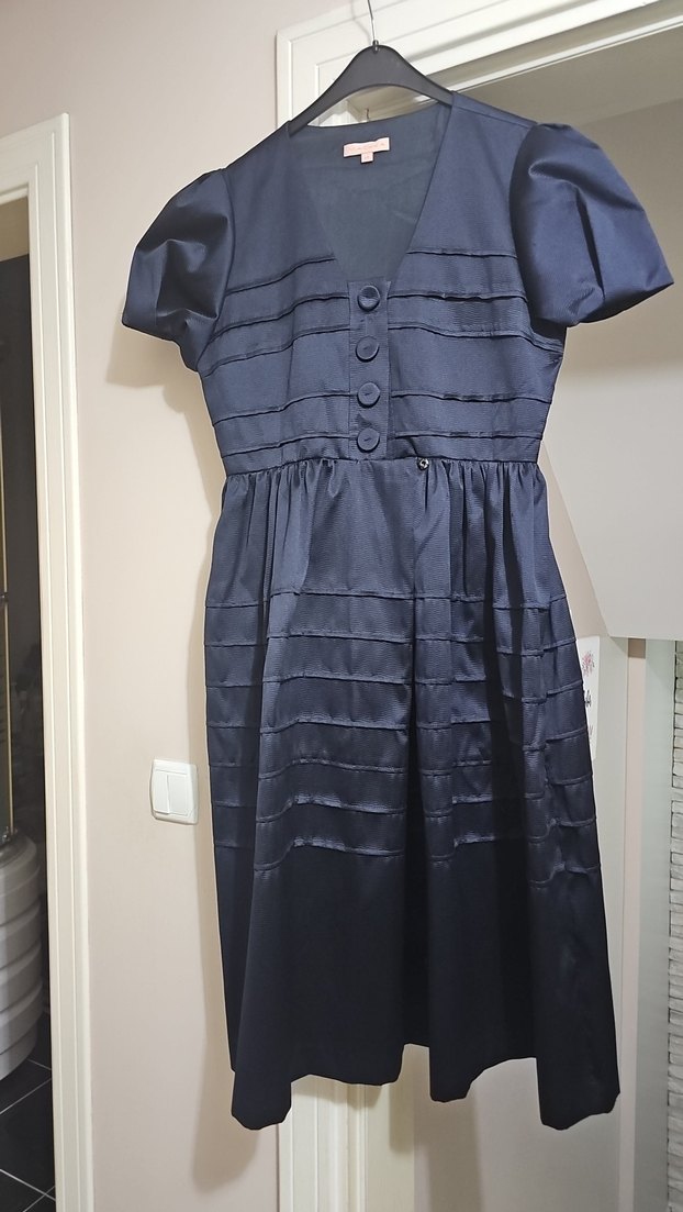Lacivert, pilili, normal boy midi elbise; yaka detayları notched lapel, askılı kısa kollu, hic kullanılmadı dolap bekliyor