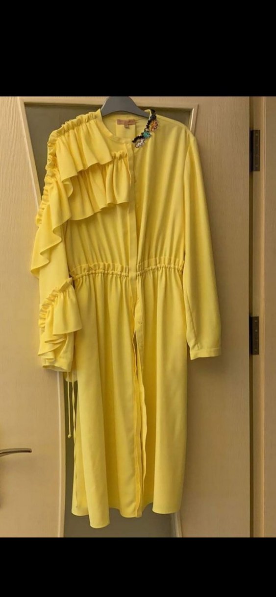 machka işlemeli Sarı Uzun Fırfırlı Elbise