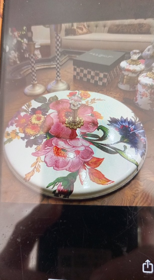 Yuvarlak tabak, canlı çiçek deseni ve bohem tarzıyla dikkat çekiyor. Ortasında dekoratif bir kulp bulunur. peynir tabağı