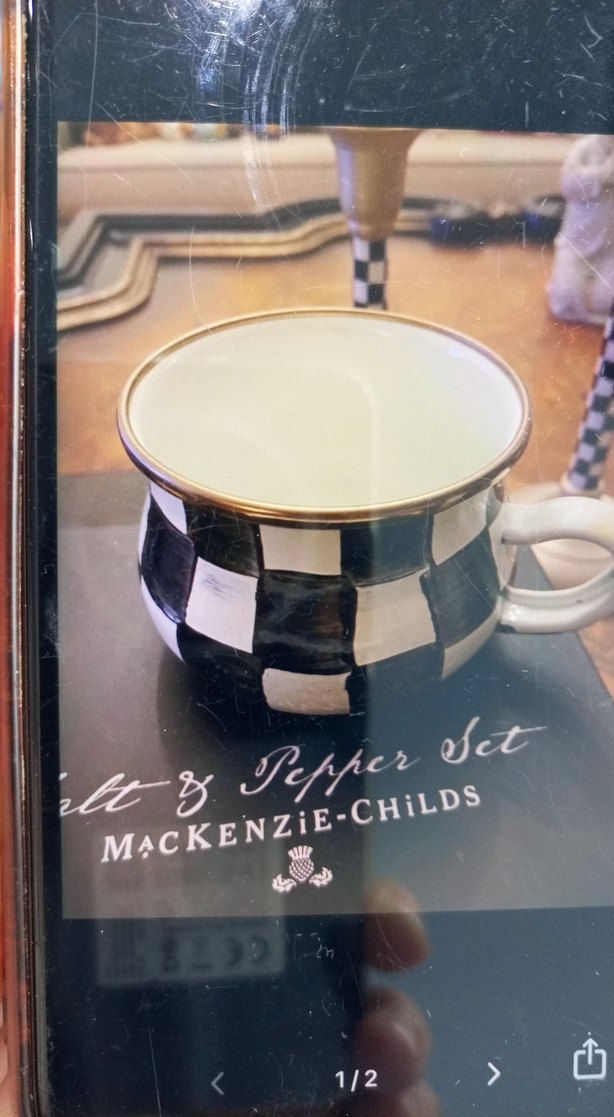 Mackenzie-Childs markalı kupa, siyah beyaz kareli desen ve altın kenarlık ile şık bir tasarım sunar. ☕kusursuz sız ürün