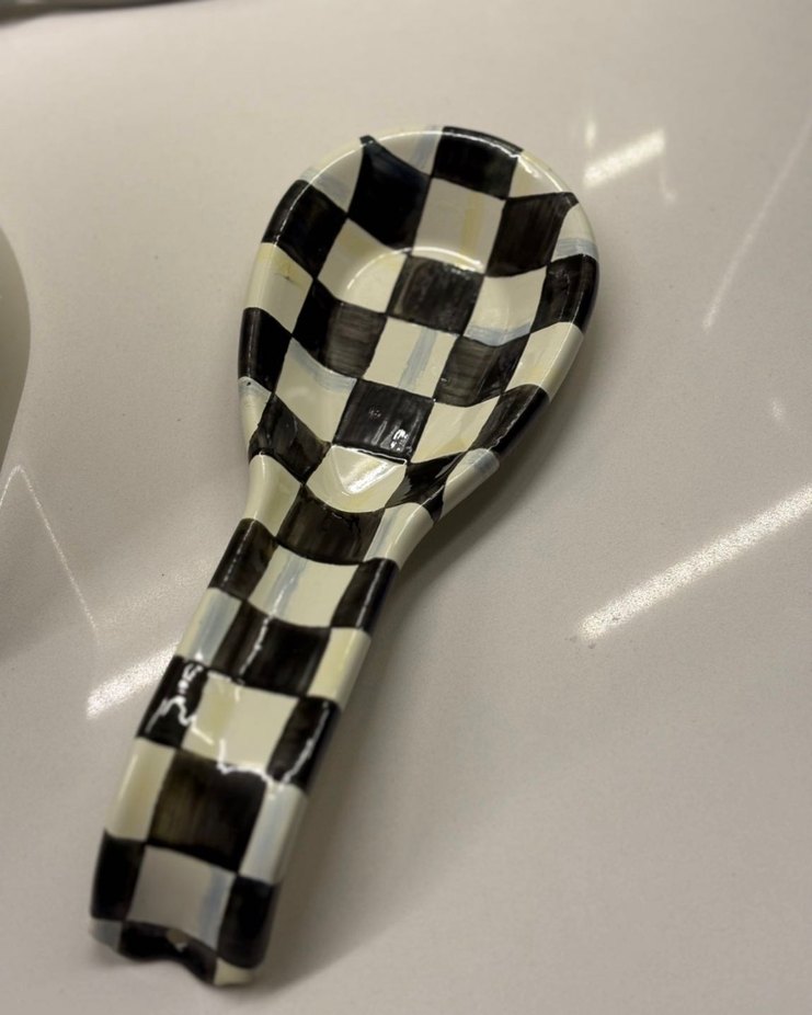 Siyah beyaz kareli desenli, emaye malzemeden yapılmış mutfak kaşığıdır. Parlak yüzeyi ve kıvrımlı şekli ile kullanışlıdır.