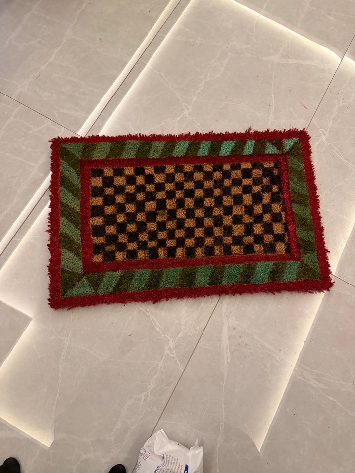 Koyu tonlarda çok renkli kareli desenli, kırmızı püsküllü ve yeşil kenarlıklı, karşı kültür tarzında halı. El yapımıdır termin 1 haftadır