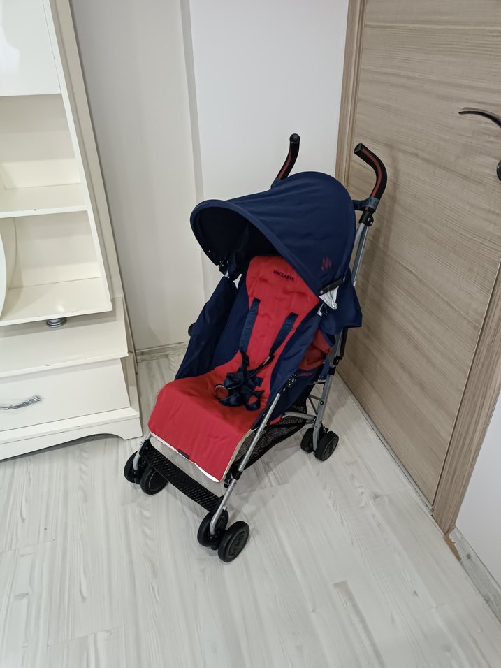 Koyu lacivert tente ve kırmızı oturma alanına sahip bebek arabası, güvenli kemer ile konforlu kullanım sunar. Hafif gövde ve dört tekerlekli yapısı sayesinde kolay hareket ettirilir. macleren marka hiç bir sıkıntı si yoktur