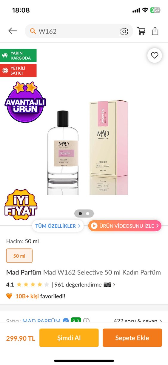 Mad Parfüm W162 Selective, 50 ml kadın parfüm, modern ve zarif kokuya sahiptir. 4,1 yıldızlı ve çokça tercih edilen bir üründür.