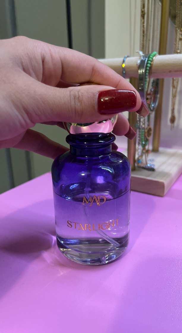 Şeffaf mor cam şişede, pembe kapaklı MAD STARLIGHT kadın parfümü, ferah ve zarif bir koku sunar.