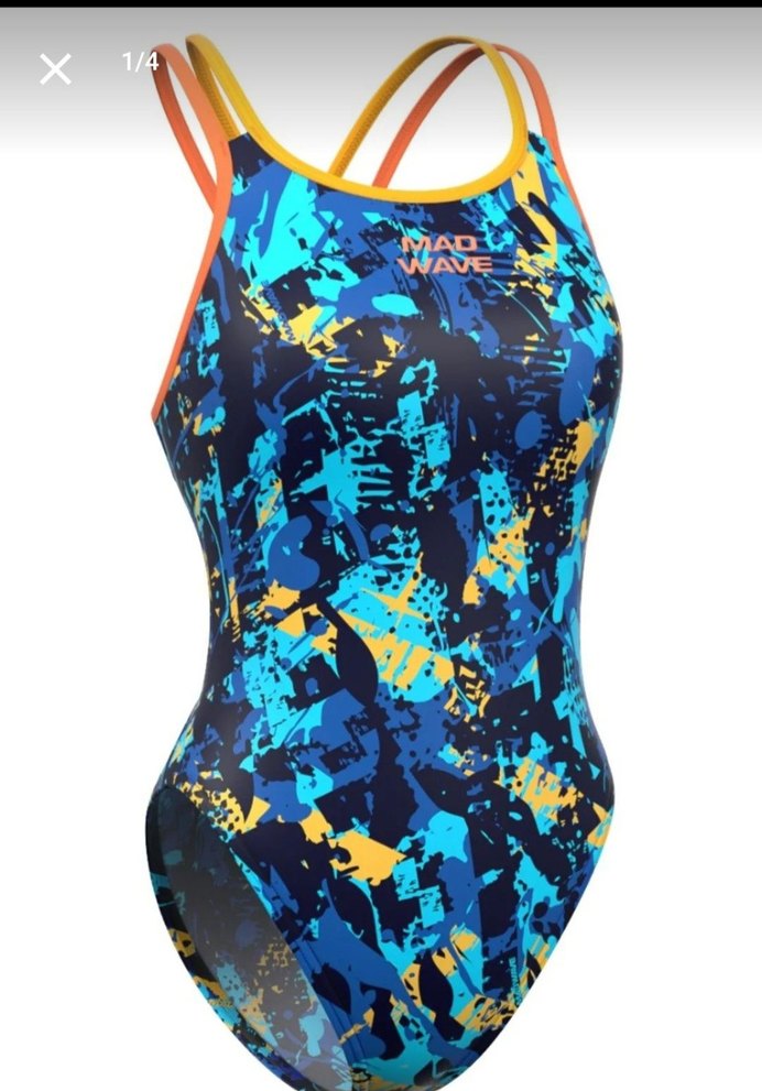 Mad Wave markalı, uzun kesim, kolsuz ve vücuda oturan bu kadın mayosu, koyu mavi tie-dye desenli ve sarı-turuncu detaylara sahip. ♀️