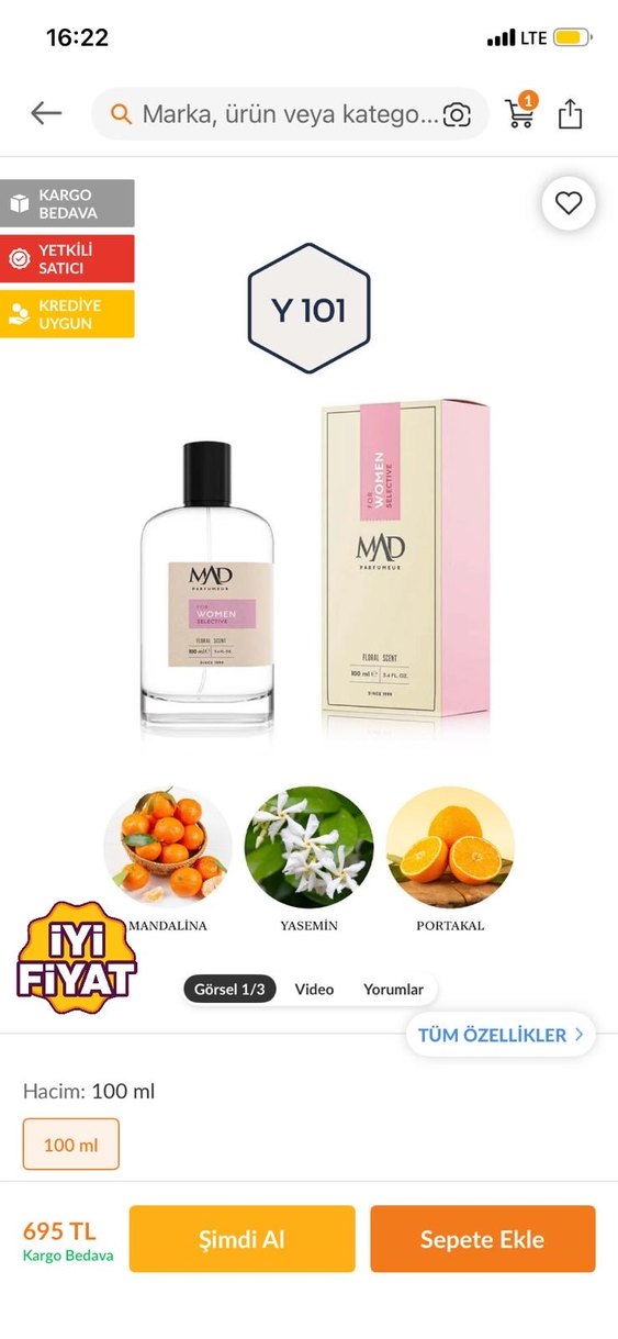 MD Women Y101 parfümü, 100 ml şişede hiç açılmamış kutulu