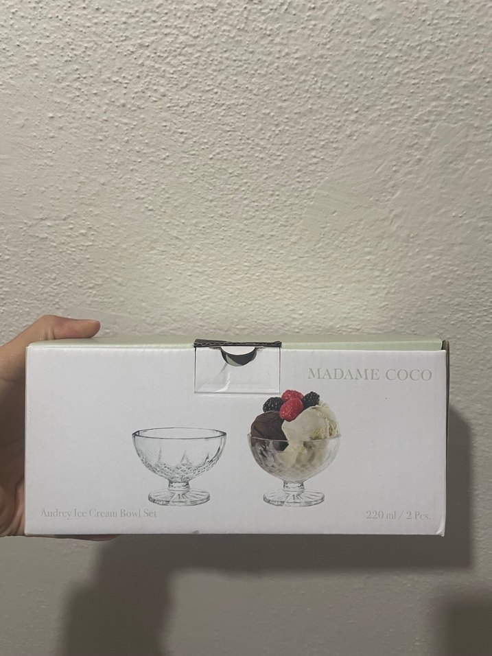 Madame Coco markalı, 220 ml kapasiteli 2 adet şeffaf cam dondurma kasesi seti. Tatlı servisleri için uygun.