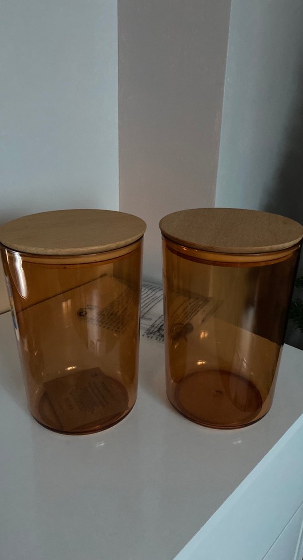 Ahşap kapaklı, 2300ml kapasiteli dört adet bej renkli saklama kabı seti. Dayanıklı ve kullanışlıdır.