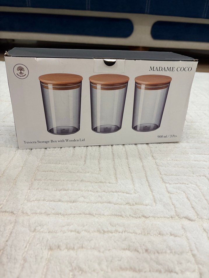 Madame Coco'nun 900 ml kapasiteli, ahşap kapaklı 3'lü bej saklama kabı seti, çeşitli yiyeceklerin saklanması için uygundur. ️