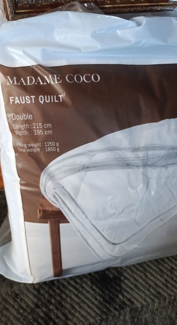 Madame Coco Faust çift kişilik yorgan, bej ve gri tonlarda baskılı desene sahiptir. 215 cm uzunluğunda, 195 cm genişliğindedir, dolgu ağırlığı 1250 g, toplam ağırlığı 1850 g'dır. ️