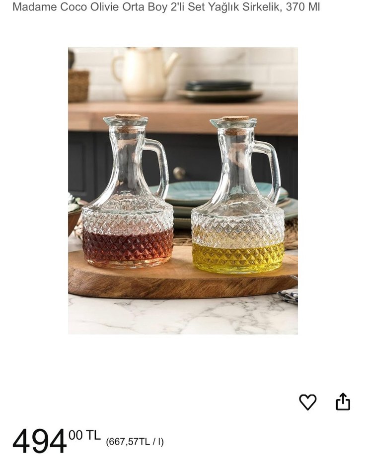 Orta boy, kulplu camdan yapılmış iki parça yağlık ve sirkelik seti. Kabartmalı desene ve haki tonuna sahip. Mutfakta kullanım için uygun.