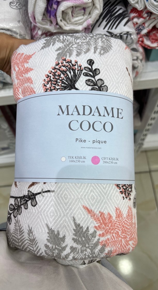 Madame Coco pembe desenli pareo, pastel tonlarda rahat ve bohem tarzda. Pike-pique kumaş, 200x230 cm ölçülerinde, günlük kullanıma uygun.