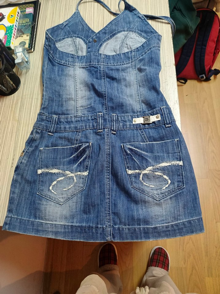 İtalya üretimi, kaliteli denim kumaştan vintage mini elbise. Askılı modeli ve bel detayıyla vücudu güzel gösterir. Y2K / 2000’ler tarz sevenler için çok şık bir parça. Temiz kullanılmıştır, kusur yoktur.